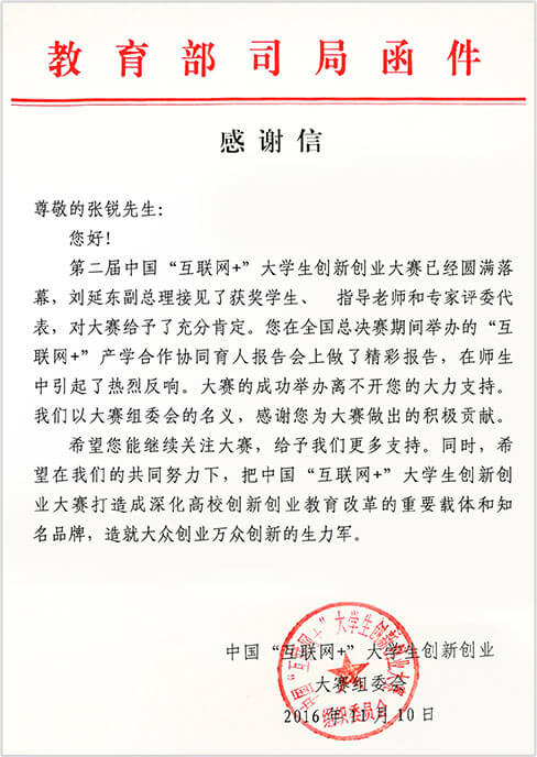 2018年,威廉希尔连续多年为中国国际互联网+大学生创新创业大赛做出积极贡献,获教育部来函致谢。